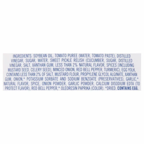Soybean Oil, Tomato Puree (Water, Tomato Paste), Distilled Vinegar, Sugar, Water, Sweet Pickle Relish (Cucumber, Sugar, Distilled Vinegar, Salt, Xanthan Gum, Less than 2% Natural Flavor, Spices [Including Mustard Seed, Celery Seed], Minced Onion, Red Bell Pepper, Turmeric), Egg Yolk, Contains Less than 2% of Salt, Mustard Flour, Propylene Glycol Alginate, Xanthan Gum, Onion (Dried), Potassium Sorbate and Sodium Benzoate (Preservatives), Garlic (Dried), Natural Flavor, Spice, Onion Powder, Garlic Powder, Calcium Disodium EDTA (to Protect Flavor), Red Bell Pepper (Dried), Oleoresin Paprika (Color).