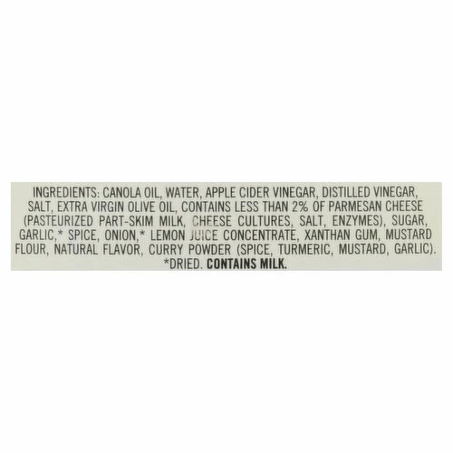 Canola Oil, Water, Apple Cider Vinegar, Distilled Vinegar, Salt, Extra Virgin Olive Oil, Contains Less than 2% of Parmesan Cheese (Pasteurized Part-Skim Milk, Cheese Cultures, Salt, Enzymes), Sugar, Garlic (Dried), Spice, Onion (Dried), Lemon Juice Concentrate, Xanthan Gum, Mustard Flour, Natural Flavor, Curry Powder (Spice, Turmeric, Mustard, Garlic).