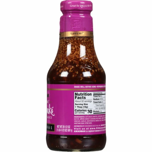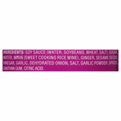 Soy Sauce (Water, Soybeans, Wheat, Salt), Sugar, Water, Mirin (Sweet Cooking Rice Wine), Ginger, Sesame Seeds, Vinegar, Garlic, Dehydrated Onion, Salt, Garlic Powder, Spices, Xanthan Gum, Citric Acid.