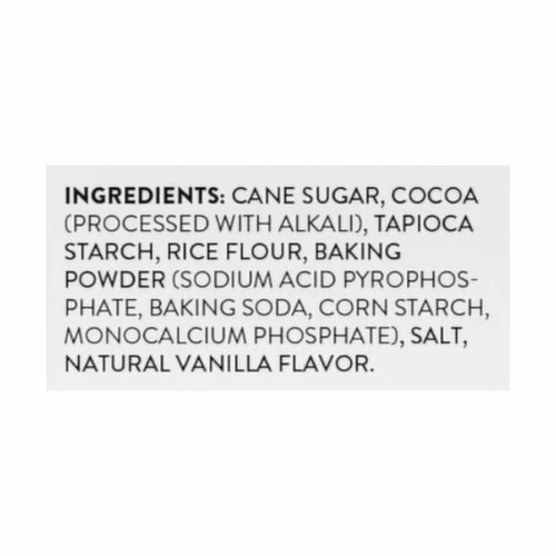 Cane Sugar, Cocoa (Processed with Alkali), Tapioca Starch, Rice Flour, Baking Powder (Sodium Acid Pyrophosphate, Baking Soda, Corn Starch, Monocalcium Phosphate), Salt, Natural Vanilla Flavor.