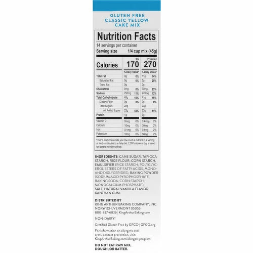 Cane Sugar, Tapioca Starch, Rice Flour, Corn Starch, Emulsifier (Rice Starch, Polyglycerol Esters of Fatty Acids, Mono and Diglycerides), Baking powder (Sodium Acid Pyrophosphate, Baking Soda, Corn Starch, Monocalcium Phosphate), Salt, Natural Vanilla Flavor, Xanthan Gum.