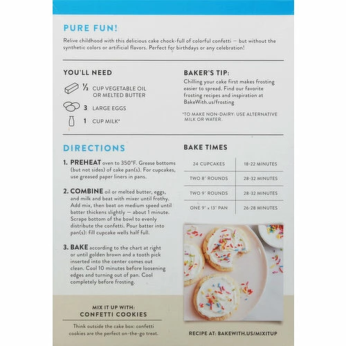Great for cupcakes. 100% employee owned. Estd 1790. New! No synthetic colors. Baking With Joy Since 1790: Our gluten free mixes are carefully crafted to deliver the best-tasting baked goods using only simple, wholesome ingredients – the way we bake every day in our kitchens. Pure fun! Relive childhood with this delicious cake chock-full of colorful confetti – but without the synthetic colors or artificial flavors. Perfect for birthdays or any celebration! Certified B Corporation: We’re committed to using the power of business as a force for social and environmental good.