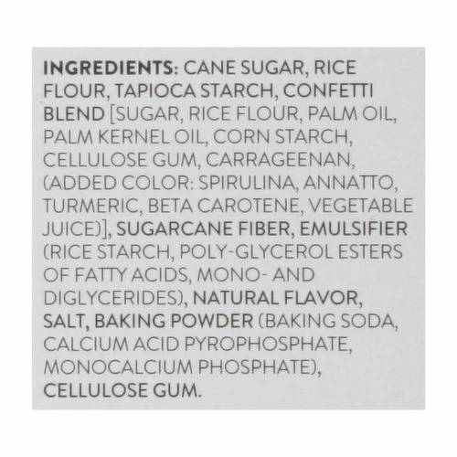 Cane Sugar, Rice Flour, Tapioca Starch, Confetti Blend (Sugar, Rice Flour, Palm Oil, Palm Kernel Oil, Corn Starch, Cellulose Gum, Carrageenan, (Added Color: Spirulina, Annatto, Turmeric, Beta Carotene, Vegetable Juice)], Sugarcane Fiber, Emulsifier (Rice Starch, Poly-Glycerol Esters of Fatty Acids, Mono- and Diglycerides), Natural Flavor, Salt, Baking Powder (Baking Soda, Calcium Acid Pyrophosphate, Monocalcium Phosphate), Cellulose Gum.
