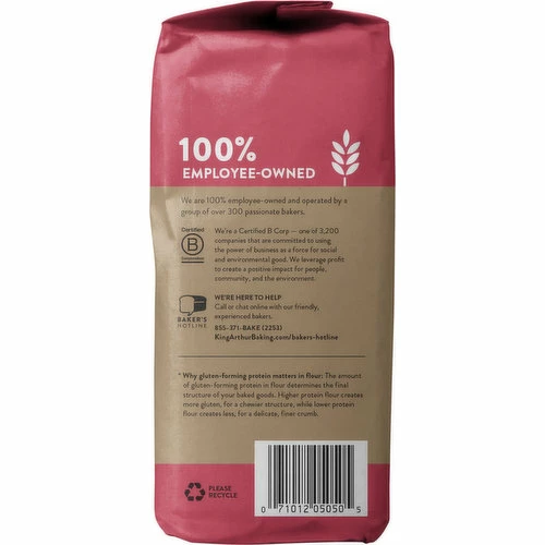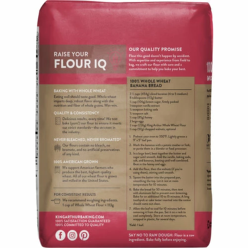 Estd 1790. Wheat Type: 100% U.S. hard red wheat grown on American farms. Protein Content: 13.8% – for adding whole grains to baked goods. 13.8% gluten-forming protein content (Why gluten-forming protein matters in flour: the amount of gluten-forming protein in flour determines the final structure of your baked goods. Higher protein flour creates more gluten, for a chewier structure, while lower protein flour creates less, for a delicate, finer crumb). Raise your flour IQ. Baking with Whole Wheat: Eating well should taste good. Whole wheat imparts deep, robust flavor along with the nutrition and fiber of whole grains. Win-win. Quality & Consistency: Delicious results, every time! We test bake (yum!) our flour to ensure it meets our strict standards – the strictest in the industry. Never Bleached, Never Bromated: Our flours contain no bleach, no bromate, and no artificial preservatives of any kind. Say not to raw dough: Flour is a raw ingredient. Bake fully before enjoying. Please recycle. 100% employee-owned. 100% American Grown: We support American farmers who produce the best, highest quality wheat. All of our wheat flour is grown and milled in the United States. We are 100% employee-owned and operated by a group of over 300 passionate bakers. Certified B Corporation: We’re a Certified B Corp – one of 3,200 companies that are committed to using the power of business as a force for social and environmental good. We leverage profit to create a positive impact for people, community, and the environment.