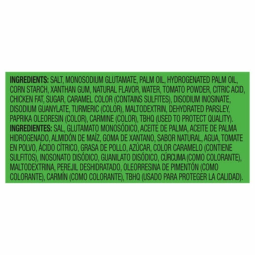 Salt, Monosodium Glutamate, Palm Oil, Hydrogenated Palm Oil, Corn Starch, Xanthan Gum, Natural Flavor, Water, Tomato Powder, Citric Acid, Chicken Fat, Sugar, Caramel Color (Contains Sulfites), Disodium Inosinate, Disodium Guanylate, Turmeric (Color), Maltodextrin, Dehydrated Parsley, Paprika Oleoresin (Color), Carmine (Color), TBHQ (Used to Protect Quality).