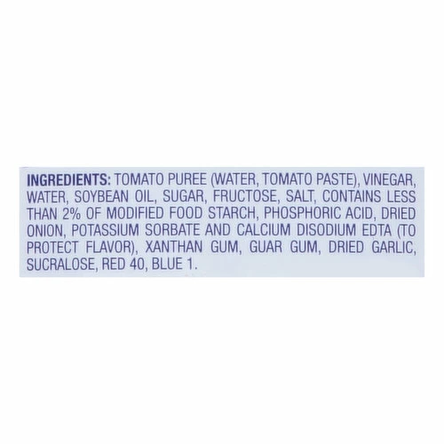 Sugar, Tomato Puree (Water, Tomato Paste), Vinegar, Soybean Oil, Water, Salt, Contains Less than 2% of Modified Food Starch, Phosphoric Acid, Dried Onions, Xanthan Gum, Guar Gum, Dried Garlic, Red 40, Blue 1, Potassium Sorbate and Calcium Disodium EDTA (to Protect Flavor).
