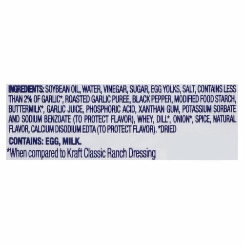 Soybean Oil, Water, Vinegar, Sugar, Egg Yolks, Salt, Contains Less than 2% of Garlic (Dried), Roasted Garlic Puree, Black Pepper, Modified Food Starch, Buttermilk (Dried), Garlic Juice, Phosphoric Acid, Xanthan Gum, Potassium Sorbate and Sodium Benzoate (to Protect Flavor), Whey, Dill (Dried), Onion (Dried), Spice, Natural Flavor, Calcium Disodium EDTA (to Protect Flavor).