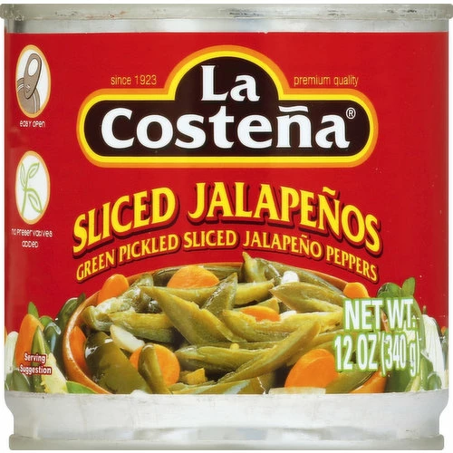 Green pickled sliced jalapeno peppers. Since 1923. Premium quality. Easy open. No preservatives added. Dispose of properly. Product of Mexico.