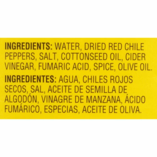 Water, Dried Red Chile Peppers, Salt, Cottonseed Oil, Cider Vinegar, Fumaric Acid, Spice, Olive Oil.