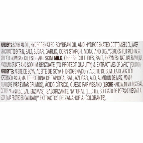 Partially Hydrogenated Soybean and Cottonseed Oil, Water, Salt, Sugar, Tapioca Maltodextrin, Garlic, Mono and Diglycerides (for Smoothness), Parmesan Cheese (Cultured Part-Skim Cow’s Milk, Salt, Enzymes), Citric Acid, Potassium Sorbate and Sodium Benzoate (to Protect Quality), Natural Flavor, Extractives of Carrot (for Color), and Nonfat Milk Solids.