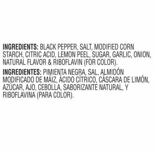 BLACK PEPPER, SALT, MODIFIED CORN STARCH, CITRIC ACID, LEMON PEEL, SUGAR, GARLIC, ONION, NATURAL FLAVOR, AND RIBOFLAVIN (FOR COLOR).