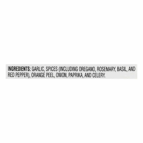 Garlic, Spices (Including Oregano, Rosemary, Basil, and Red Pepper), Orange Peel, Paprika and Celery.