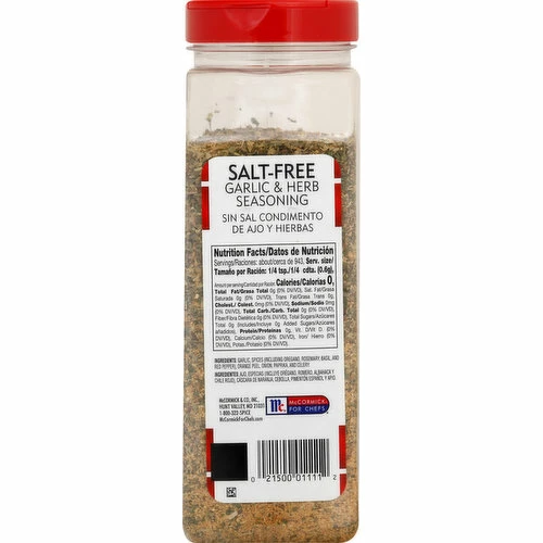 Formerly McCormick salt-free garlic & herb seasoning. No MSG added. Filled by Weight. McCormickForChefs.com.