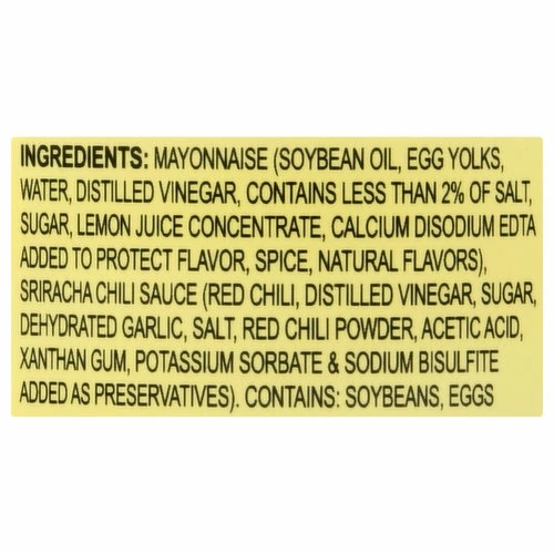 Mayonnaise (Soybean Oil, Egg Yolks, Water, Distilled Vinegar, Contains Less than 2% of Salt, Sugar, Lemon Juice Concentrate, Calcium Disodium EDTA Added to Protect Flavor, Spice, Natural Flavors), Sriracha Chili Sauce (Red Chili, Distilled Vinegar, Sugar, Dehydrated Garlic, Salt, Red Chili Powder, Acetic Acid, Xanthan Gum, Potassium Sorbate & Sodium Bisulfite Added as Preservatives).