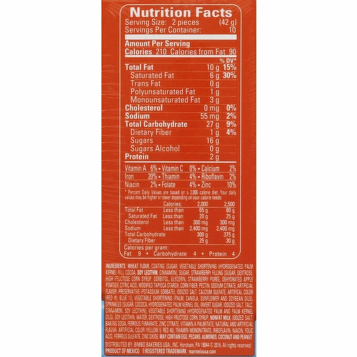 Filled cookies. Per 2 Pieces Serving: 210 calories; 6 g sat fat (30% DV); 55 mg sodium (2% DV); 16 g sugars. Keep your city clean. MarineLaUsa.com. Facebook: facebook.com/gansitousa. Instagram: instagram.com/gansitomarinelausa. Questions or Comments? Call toll-free 1-800-984-0989 (9 am – 5 pm, Monday-Friday, central time). Please Recycle: Please recycle this carton when possible. Recycling facilities for this carton may not be available in your area. Product of Mexico.