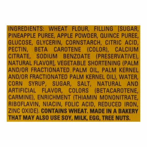 Wheat Flour, Filling [High Fructose Corn Syrup, Sugar, Pineapple and Quince Puree, Glycerin, Cornstarch, Dehydrated Apple Powder, Pectin, Sodium Alginate, Citric Acid, Calcium Citrate, Artificial Flavor, Sodium Benzoate (Preservative)], Vegetable Shortening (Palm and/or Fractionated Palm Oil, Oil, Palm Kernel and/or Fractionated Palm Kernel Oil, Soy Lecithin), Water, Corn Syrup, Sugar, Salt, Natural and Artificial Flavor, Maltodextrin, Betacarotene, Carmine, Enrichment (Thiamin Mononitrate, Riboflavin, Niacin, Folic Acid, Reduced Iron, Zinc Oxide).