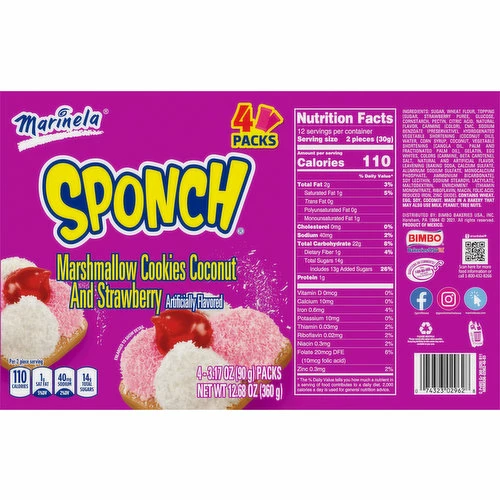 Enjoy the delectable taste of a Sponch crispy cookie topped with artificially flavored marshmallow and dusted with coconut, then finished off with just the right amount of strawberry topping. No need to go to the bakery; Sponch cookies are wrapped for freshness, every time.