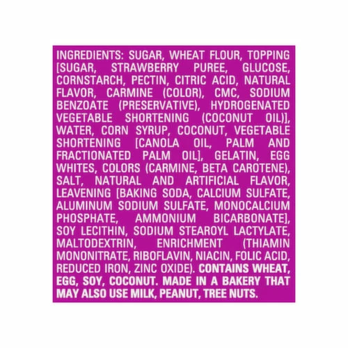 Sugar, Wheat Flour, Topping [Sugar, Strawberry Puree, Glucose, Cornstarch, Pectin, Citric Acid, Natural Flavor, Carmine (Color), CMC, Sodium Benzoate (Preservative), Hydrogenated Vegetable Shortening (Coconut Oil)], Water, Corn Syrup, Coconut, Vegetable Shortening [Canola Oil, Palm and Fractionated Palm Oil], Gelatin, Egg Whites, Colors (Carmine, Beta Carotene), Salt, Natural and Artificial Flavor, Leavening [Baking Soda, Calcium Sulfate, Aluminum Sodium Sulfate, Monocalcium Phosphate, Ammonium Bicarbonate], Soy Lecithin, Sodium Stearoyl Lactylate, Maltodextrin, Enrichment (Thiamin Mononitrate, Riboflavin, Niacin, Folic Acid, Reduced Iron, Zinc Oxide).