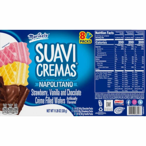 Suavicremas Vanilla: Ingredients Common to All Cookies: Vegetable Shortening (Hydrogenated Palm and Palm Kernel Oil, Soy Lecithin), Sugar, Wheat Flour, Cornstarch, Maltodextrin, Whole Milk, Cocoa, Water, Natural and Artificial Flavor, Soy Lecithin, Salt, Soybean Oil, Baking Soda, Yellow 5, Yellow 6, Red 40, Red 3, Blue 1, Enrichment (Thiamin Mononitrate, Riboflavin, Niacin, Folic Acid, Reduced Iron, Zinc Oxide). Suavicremas Chocolate: Ingredients Common to All Cookies: Vegetable Shortening (Hydrogenated Palm and Palm Kernel Oil, Soy Lecithin), Sugar, Wheat Flour, Cornstarch, Maltodextrin, Whole Milk, Cocoa, Water, Natural and Artificial Flavor, Soy Lecithin, Salt, Soybean Oil, Baking Soda, Yellow 5, Yellow 6, Red 40, Red 3, Blue 1, Enrichment (Thiamin Mononitrate, Riboflavin, Niacin, Folic Acid, Reduced Iron, Zinc Oxide). Suavicremas Strawberry: Ingredients Common to All Cookies: Vegetable Shortening (Hydrogenated Palm and Palm Kernel Oil, Soy Lecithin), Sugar, Wheat Flour, Cornstarch, Maltodextrin, Whole Milk, Cocoa, Water, Natural and Artificial Flavor, Soy Lecithin, Salt, Soybean Oil, Baking Soda, Yellow 5, Yellow 6, Red 40, Red 3, Blue 1, Enrichment (Thiamin Mononitrate, Riboflavin, Niacin, Folic Acid, Reduced Iron, Zinc Oxide).