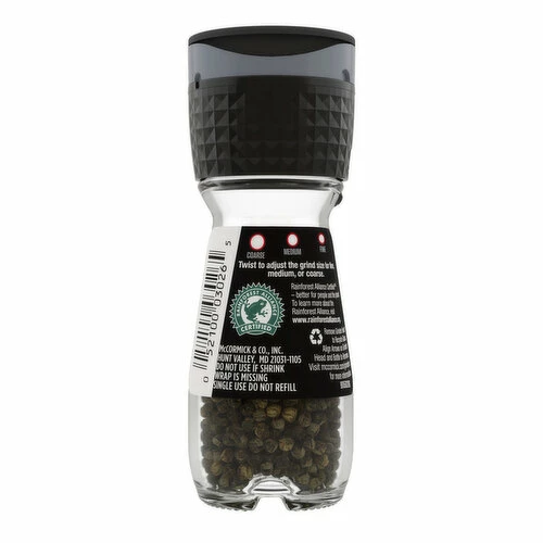 Enjoy freshly ground pepper wherever you need it with McCormick® Black Peppercorn Grinder. Simply adjust the built-in grinder to fine, medium or coarse grind then twist to add just the right amount of pepper.This kitchen essential delivers sharp, earthy flavor and aroma to almost any dish. Choose coarse ground black pepper to rub on meats or finely ground pepper for eggs, pasta, salads or vegetables. Keep this whole peppercorn grinder along with a salt grinder in the kitchen, at the table or by the grill for freshly ground flavor anytime. McCormick Black Pepper Grinder is Rainforest Alliance Certified! That means our black pepper was produced with methods that support social, economic, and environmental pillars of sustainability.