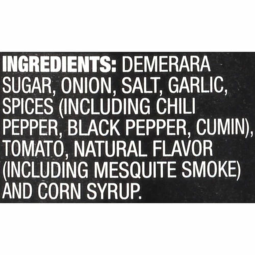 Demerara Sugar, Onion, Salt, Garlic, Spices (Including Chili Pepper, Black Pepper, Cumin), Tomato, Natural Flavor (Including Mesquite Smoke), and Corn Syrup.