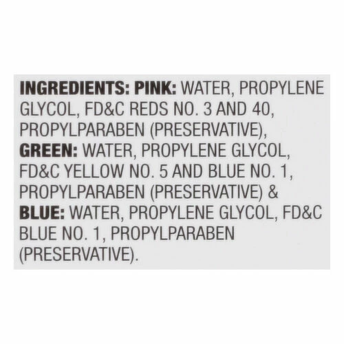 Pink: Water, Propylene Glycol, FD&C Reds 3 and 40, Propylparaben (Preservative). Green: Water, Propylene Glycol, FD&C Yellow 5 and Blue 1, Propylparaben (Preservative) & Blue: Water, Propylene Glycol, FD&C Blue 1, Propylparaben (Preservative).
