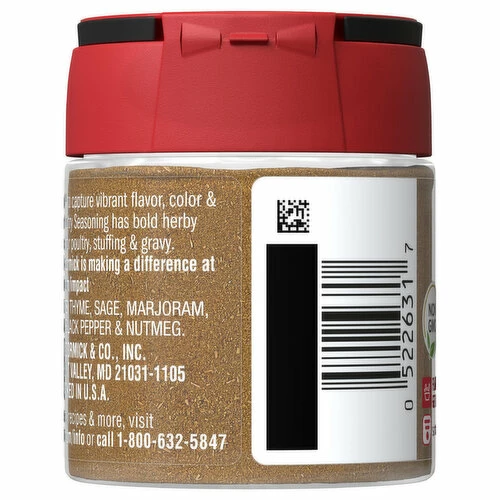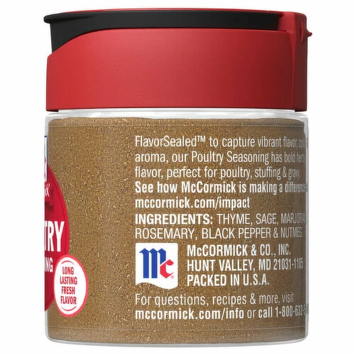 Expertly blended for savory herb flavor, McCormick® Poultry Seasoning is a mix of thyme, sage and other herbs and spices. Its bold herby flavor is perfect for poultry, stuffing and gravy. This appealing seasoning blend adds nuanced depth to so many chicken dishes, including roast chicken, fried chicken, stews, soups and chicken salad. It wouldn’t be a traditional Thanksgiving without a roast turkey, bread stuffing or gravy seasoned just right with poultry seasoning. Its uses stretch beyond just poultry. Add it to spice rubs and marinades for beef, pork, veal and lamb. Poultry seasoning also adds rich, savory flavor to veggie or meat burgers, meatloaf, roasted vegetables, as well as casseroles of holiday dinner leftovers, like pot pies.