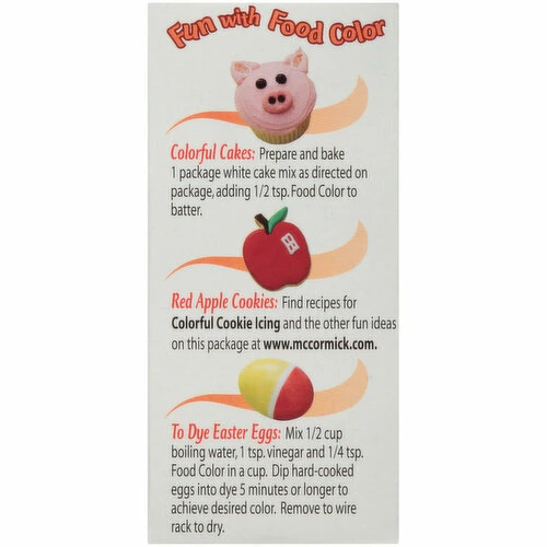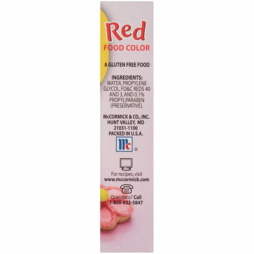 McCormick Red Food Color Single Pack, McCormick Red Food Color is perfect for adding fun, lively color to any occasion. Whether you are decorating cupcakes or making homemade slime, this food color offers consistent and true red color every time. This Red Food Color is safe for mixing with foods, so you can add a pop of color to any recipe or holiday. It is great for Valentine’s Day confections, an Easter egg dye, or red, white blue treats for July 4th celebrations. Make Christmas gift-giving even more colorful with decorated cookies, red popcorn balls, and peppermint bark. The bottle’s easy-pour spout means the color goes exactly where you want it, making it ideal for coloring kids’ arts and crafts, like DIY slime and kinetic sand. This McCormick Red Food Color is in a Plastic box that is 1 fluid ounce. Store this shelf-stable item at an ambient temperature.