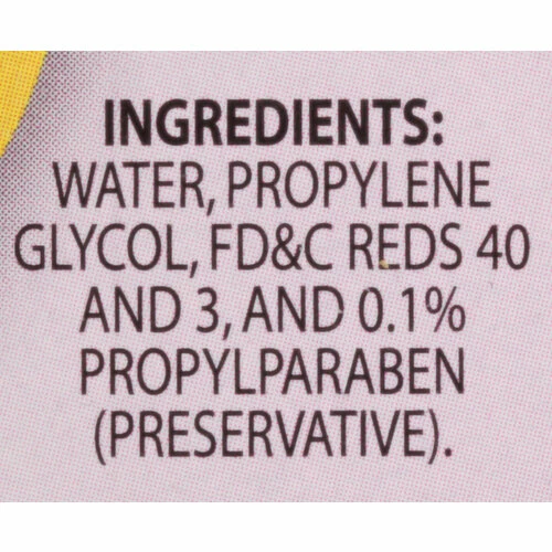 Water, Propylene Glycol, FD&C Reds 40 and 3, and 0.1% Propylparaben (Preservative).