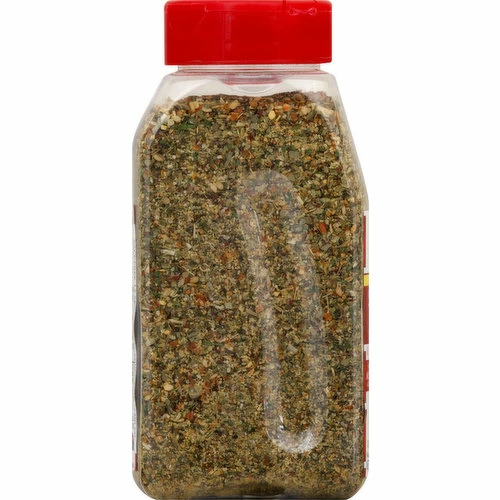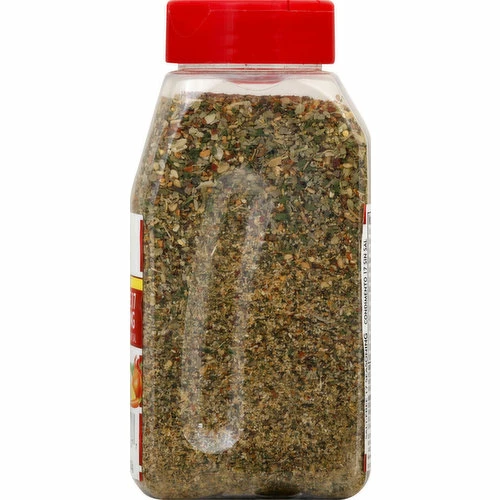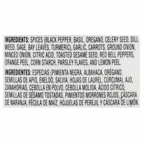 Spices (Black Pepper, Basil, Oregano, Celery Seed, Dill Weed, Sage, Bay Leaves, Turmeric), Garlic, Carrots, Ground Onion, Minced Onion, Citric Acid, Toasted Sesame Seed, Red Bell Peppers, Orange Peel, Corn Starch, Parsley Flakes, and Lemon Peel.