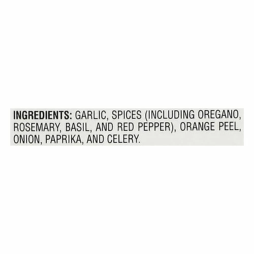 Garlic, Spices (Including Oregano, Rosemary, Basil and Red Pepper), Orange Peel, Onion, Paprika, and Celery.