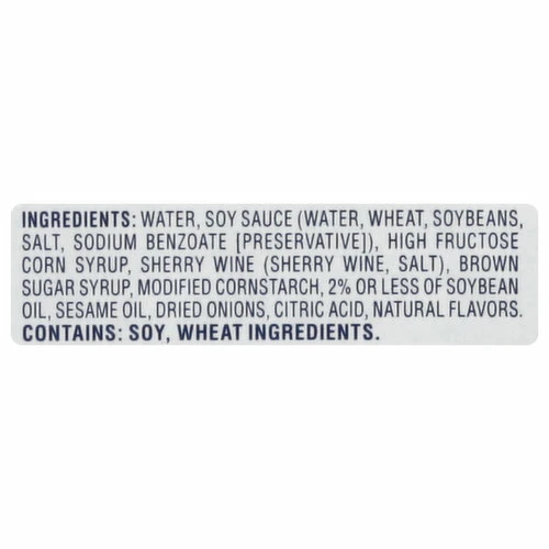 Water, Soy Sauce (Water, Wheat, Soybeans, Salt, Sodium Benzoate [Preservative]), High Fructose Corn Syrup, Sherry Wine (Sherry Wine, Salt), Brown Sugar Syrup, Modified Cornstarch, 2% or Less of Soybean Oil, Sesame Oil, Dried Onions, Citric Acid, Natural Flavors.