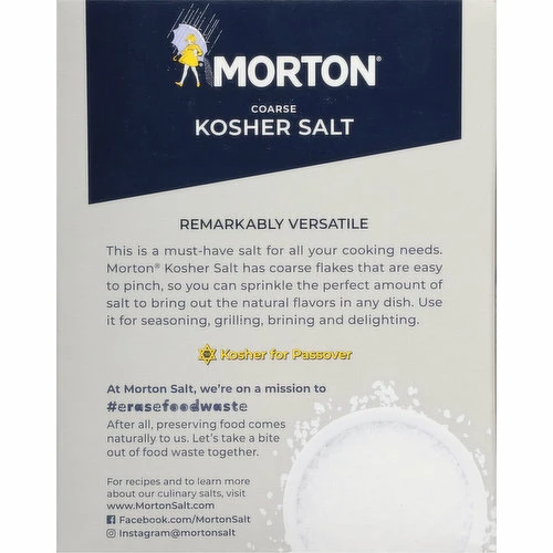 Trusted quality 1848. Remarkably versatile. This is a must-have salt for all your cooking needs. Morton Kosher Salt has coarse flakes that are easy to pinch, so you can sprinkle the perfect amount of salt to bring out the natural flavors in any dish. Use it for seasoning, grilling, brining, and delighting. At Morton Salt, we’re on a mission to (hashtag)eresefeeilwaste. After all, preserving food comes naturally to us. Let’s take a bite out of food waste together.
