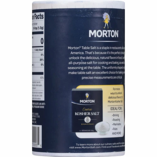 Food service. Morton Table Salt is a staple in restaurants all across America. That’s because it’s the perfect choice to unlock the delicious, natural flavors in food. Use this all-purpose salt for cooking and baking as well as for seasoning at the table. The uniformly shaped crystals make table salt an excellent choice for baking, where precise measurements are critical. Ideal For: Brining; Roasting; Marinades; Rubs and more!