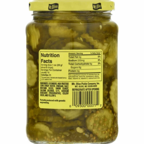 Mt. Olive Bread & Butter Chips feature the old fashioned sweet pickle flavor that you have always loved. Both salty and sweet, Mt. Olive Old Fashioned Sweet Bread & Butter Chips are a crunchy pickle chip that taste great as a side, on sandwiches, or with a salad! These delightful Bread & Butter Chips feature crispy cucumbers thinly sliced and mixed with vinegar, celery & mustard seeds, and onion flakes for a mouthful of flavor. These classic-cut Bread & Butter pickle chips pack a bold taste. Mt. Olive Pickle Co. has been producing your favorite pickles for nearly 100 years, and Mt. Olive is proud to be the #1 best-selling brand of pickles, peppers and relishes in the United States. Our crunchy, flavorful pickle goodness comes from the corner of Cucumber & Vine in our hometown in North Carolina.