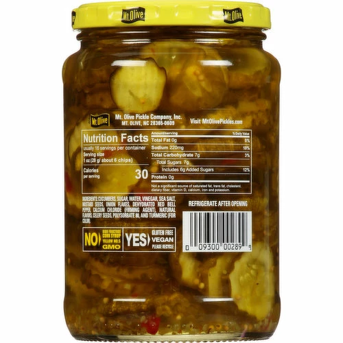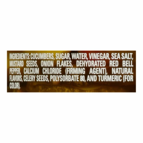 Cucumbers, Sugar, Water, Vinegar, Sea Salt, Mustard Seeds, Onion Flakes, Dehydrated Red Bell Pepper, Calcium Chloride (Firming Agent), Natural Flavors, Celery Seeds, Polysorbate 80, and Turmeric (for Color).