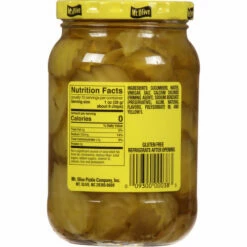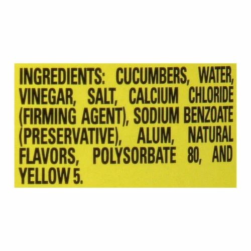 Cucumber, Water, Vinegar, Salt, Calcium Chloride (Firming Agent), Sodium Benzoate (Preservative), Alum, Natural Flavors, Polysorbate 80, and Yellow 5.