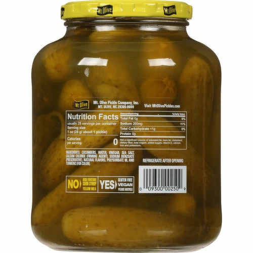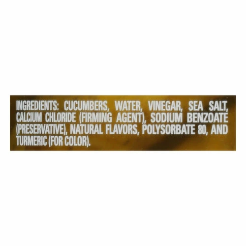 Cucumbers, Water, Vinegar, Sea Salt, Calcium Chloride (Firming Agent), Sodium Benzoate (Preservative), Natural Flavors, Polysorbate 80, and Turmeric (for Color).