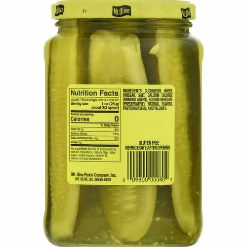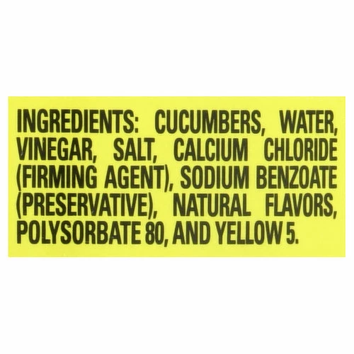 Cucumbers, Water, Vinegar, Salt, Calcium Chloride (Firming Agent), Sodium Benzoate (Preservative), Natural Flavors, Polysorbate 80, and Yellow 5.