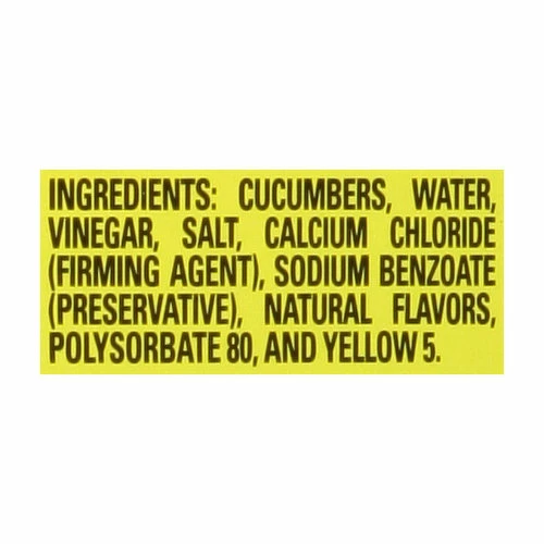 Cucumbers, Water, Vinegar, Salt, Calcium Chloride (Firming Agent), Sodium Benzoate (Preservative), Natural Flavors, Polysorbate 80, and Yellow 5.