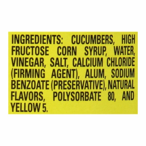 Cucumbers, High Fructose Corn Syrup, Water, Vinegar, Salt, Calcium Chloride (Firming Agent), Alum, Sodium Benzoate (Preservative), Natural Flavors, Polysorbate 80, and Yellow 5.