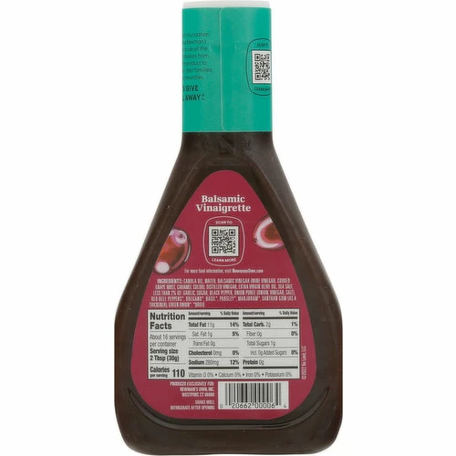 Canola Oil, Water, Balsamic Vinegar (Wine Vinegar, Cooked Grape Must, Caramel Color), Distilled Vinegar, Extra Virgin Olive Oil, Sea Salt, Less than 2% of: Garlic, Sugar, Black Pepper, Onion Puree (Onion, Vinegar, Salt), Red Bell Peppers (Dried), Oregano (Dried), Basil (Dried), Parsley (Dried), Marjoram (Dried), Xanthan Gum (as a Thickener), Green Onion (Dried).