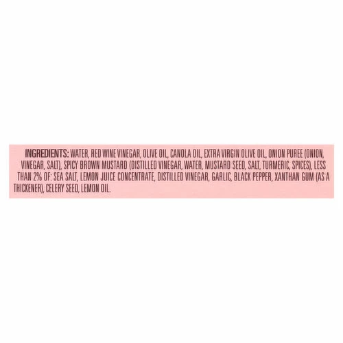 Water, Red Wine Vinegar, Olive Oil, Canola Oil, Extra Virgin Olive Oil, Onion Puree (Onion, Vinegar, Salt), Spicy Brown Mustard (Distilled Vinegar, Water, Mustard Seed, Salt, Turmeric, Spices), Less than 2% of: Sea Salt, Lemon Juice Concentrate, Distilled Vinegar, Garlic, Black Pepper, Xanthan Gum (as a Thickener), Celery Seed, Lemon Oil.
