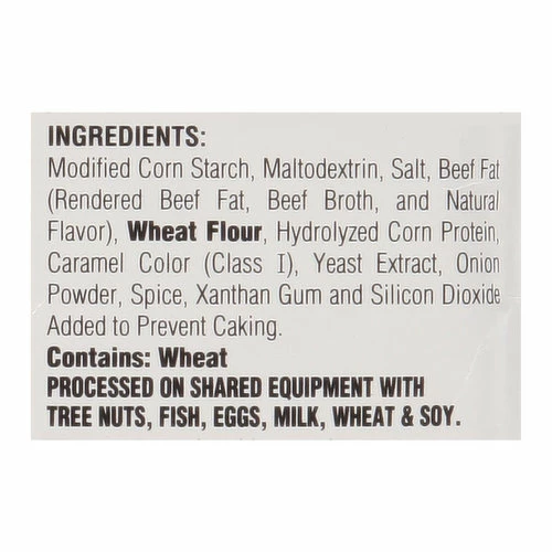 Modified Corn Starch, Maltodextrin, Salt, Beef Fat (Rendered Beef Fat, Beef Broth, and Natural Flavor), Wheat Flour, Hydrolyzed Corn Protein, Yeast Extract, Caramel Color (Class I), Yeast Extract, Onion Powder, Spice, Xanthan Gum and Silicon Dioxide Added to Prevent Caking.