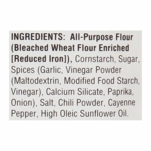 All-Purpose Flour (Bleached Wheat Flour Enriched [Reduced Iron]), Cornstarch, Sugar, Spices (Garlic, Vinegar Powder (Maltodextrin, Modified Food Starch, Vinegar), Calcium Silicate, Paprika, Onion), Salt, Chili Powder, Cayenne Pepper, High Oleic Sunflower Oil.