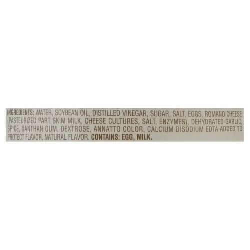 Water, Soybean Oil, Distilled Vinegar, Sugar, Salt, Eggs, Romano Cheese (Pasteurized Part Skim Milk, Cheese Cultures, Salt, Enzymes), Dehydrated Garlic, Spice, Xanthan Gum, Dextrose, Annatto Color, Calcium Disodium EDTA Added to Protect Flavor, Natural Flavor.