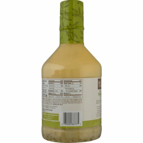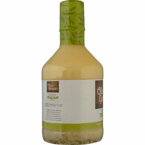 No artificial flavors. Gluten free. Italian Kitchen. Our Signature Italian dressing has been a favorite with our guests for over 35 years. It’s crafted from a special blend of Italian spices, oil, and vinegar. Great for salads and marinades! No high fructose corn syrup. www.olivegarden.com. Questions or comments? www.olivegarden.com; 1-888-254-0314.
