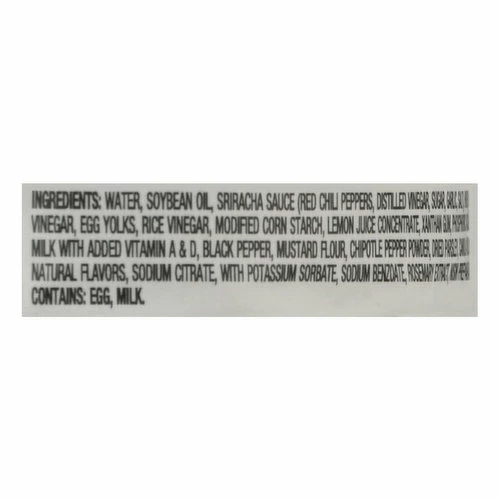 Water, Soybean Oil, Sriracha Sauce (Red Chili Peppers, Distilled Vinegar, Sugar, Garlic, Salt), Honey, Sugar, Less than 2% of: Salt, Distilled Vinegar, Egg Yolks, Rice Vinegar, Modified Corn Starch, Lemon Juice Concentrate, Xanthan Gum, Phosphoric Acid, Garlic Powder, Onion Powder, Lowfat Milk with Added Vitamin A & D, Black Pepper, Mustard Flour, Chipotle Pepper Powder, Dried Parsley, Canola Oil, Spice, Lactic Acid, Cultures, Pectin, Natural Flavors, Sodium Citrate, with Potassium Sorbate, Sodium Benzoate, Rosemary Extract, Nisin Preparation and Natamycin to Protect Quality.
