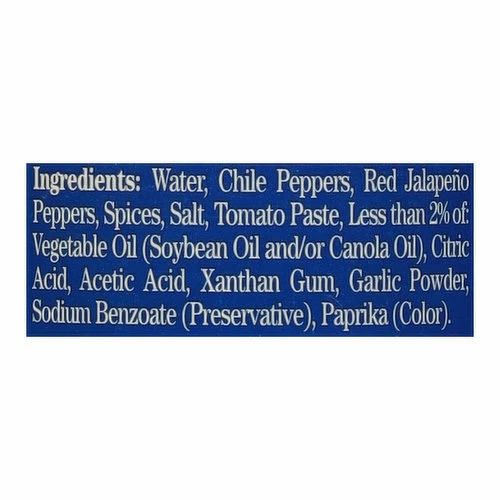 Water, Chile Peppers, Red Jalapeno Peppers, Spices, Salt, Tomato Paste, Less than 2% of: Vegetable Oil (Soybean Oil and/or Canola Oil), Citric Acid, Acetic Acid, Xanthan Gum, Garlic Powder, Sodium Benzoate (Preservative), Paprika (Color).