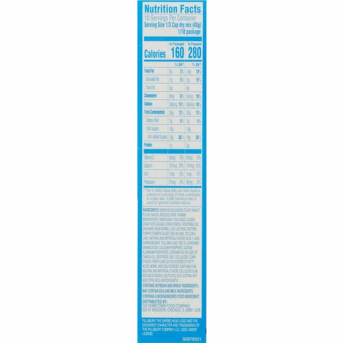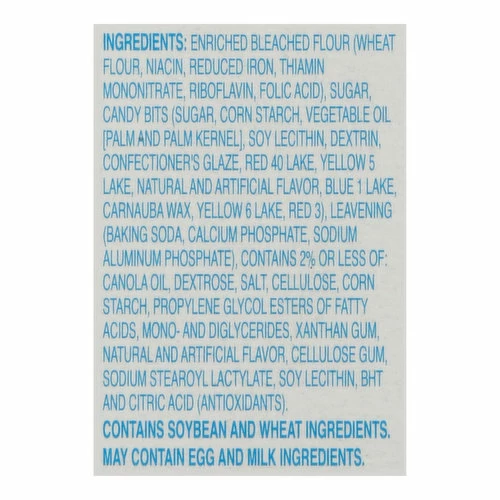 Enriched Bleached Flour (Wheat Flour, Niacin, Reduced Iron, Thiamin Mononitrate, Riboflavin, Folic Acid), Sugar, Candy Bits (Sugar, Corn Starch, Vegetable Oil [Palm and Palm Kernel], Soy Lecithin, Dextrin, Confectioner’s Glaze, Red 40 Lake, Yellow 5 Lake, Natural and Artificial Flavor, Blue 1 Lake, Carnauba Wax, Yellow 6 Lake, Red 3), Leavening (Baking Soda, Calcium Phosphate, Sodium Aluminum Phosphate), Contains 2% or Less of: Canola Oil, Dextrose, Salt, Cellulose, Corn Starch, Propylene Glycol Esters of Fatty Acids, Mono- and Diglycerides, Xanthan Gum, Natural and Artificial Flavor, Cellulose Gum Sodium Stearoyl Lactylate, Soy Lecithin, BHT and Citric Acid (Antioxidants).
